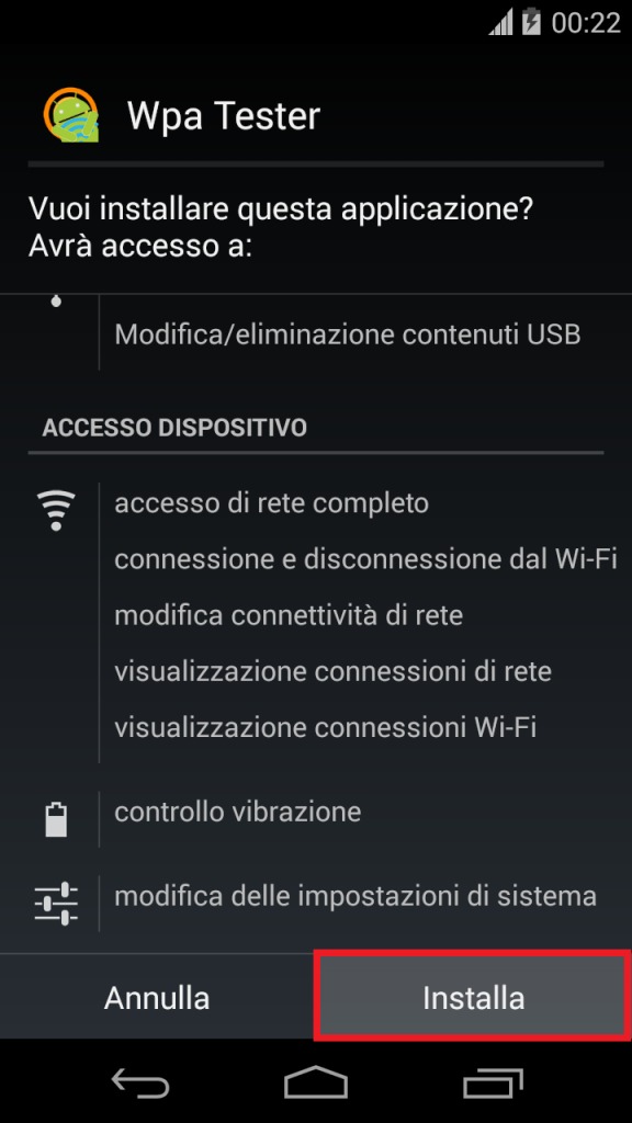 7) A questo punto si aprirà la schermata d’installazione dell’app. Scorrere la lista dei permessi richiesti e premere sulla voce Installa.
